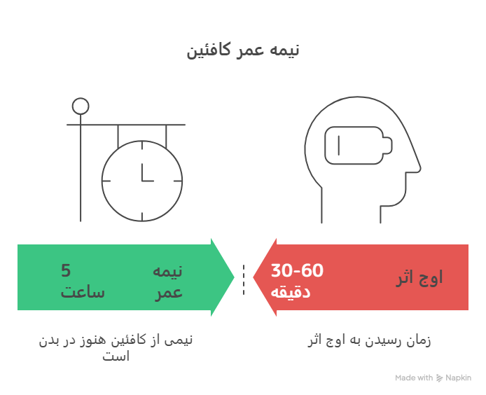 جدول: چرخه زندگی کافئین در بدن (بر اساس دادهها) همانطور که قول دادیم، درک زمانبندی همهچیز است. این جدول نشان میدهد که کافئین چگونه در بدن شما عمل میکند: